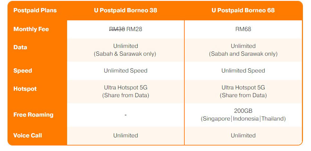 The two plans provide unlimited 5G/high-speed 4G data, unlimited hotspot also unlimited calls to all local networks. For a limited time, the U Postpaid Borneo 38 is being offered to customers for only RM28/month instead of RM38, starting from today (1 December) until a date mentioned later in the future. The U Postpaid Borneo 68 meanwhile will cost RM68/month.