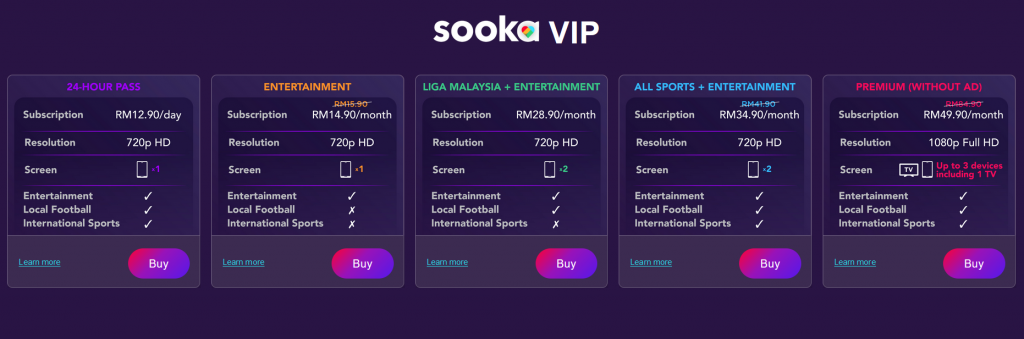 The streaming service now offers four different packages aimed at different target markets. The cheapest package is RM 14.90 a month, designed for a single screen with up to 720p HD resolution. For those looking to watch entertainment shows as well as Liga Malaysia matches, the pack is RM 28.90 a month for two devices at HD resolution. International sports fans can opt for the All Sports & Entertainment pack for RM 34.90 a month, again for two HD devices. Lastly, the ultimate pack costs RM 49.90 a month for up to three devices, which includes one TV at Full HD resolution.