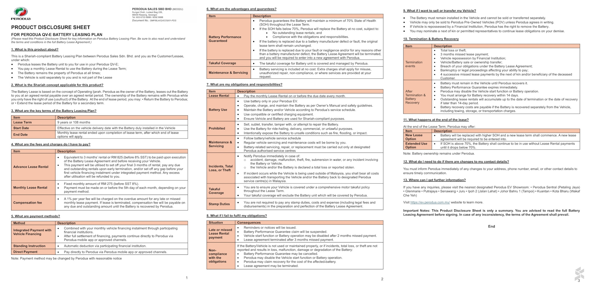 Under the Shariah-compliant Perodua QV-E Battery Leasing Plan, customers have to pay RM275 per month for 9 years (108 months). According to the product disclosure sheet, which you can obtain through the P-Circle super app, the payment generally must be made on or before the 5th day of the month.
