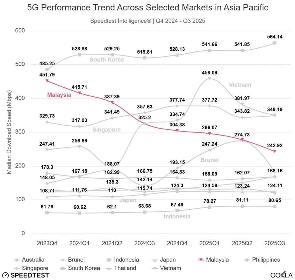 According to Ookla’s recent report, Malaysia’s median 5G download speed has dropped by 46%, from 451.79 Mbps in Q4 2023 to 242.92 Mbps in Q3 2025.