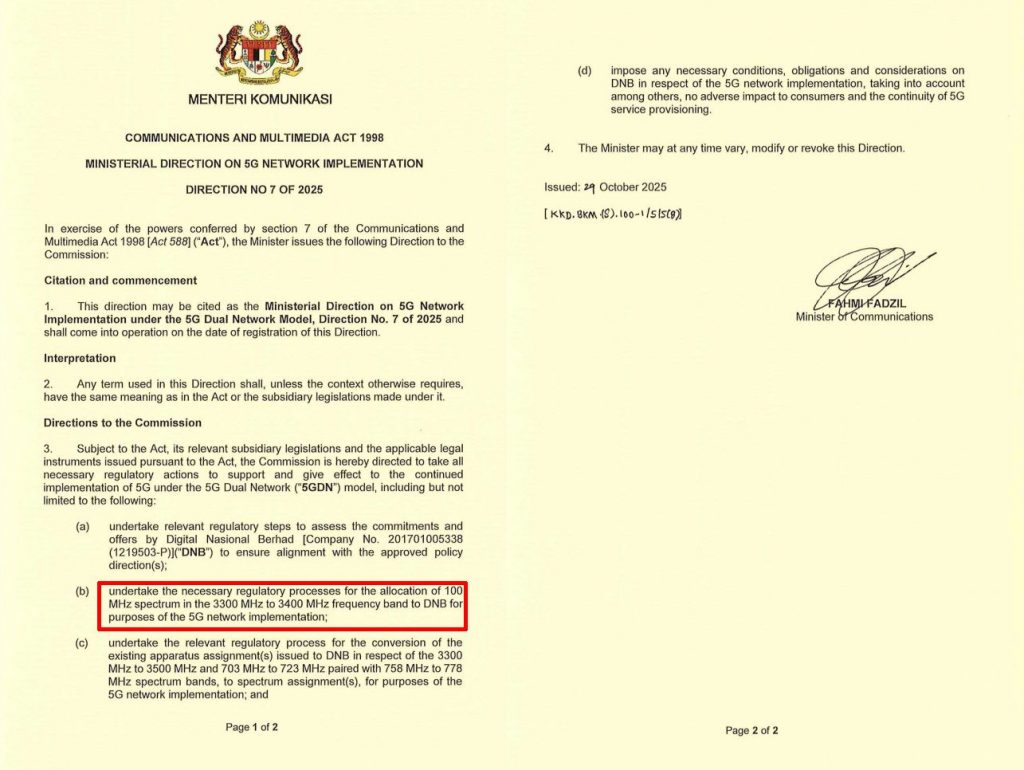 When Malaysia decided to adopt a dual 5G network model, DNB had to give up half (100MHz) of its 3.5GHz spectrum. Under the Ministerial Direction No. 1 of 2024 issued by Communications Minister Datuk Fahmi Fadzil on 21st June 2024, the government reassigned DNB’s 3.5GHz to 3.6GHz block for the second 5G network.