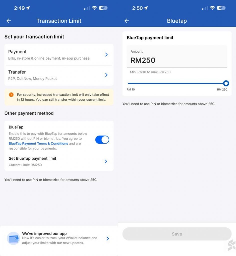 For quicker payment, users can choose to bypass authentication for amounts of RM250 and below. This can be done by enabling the feature through TNG eWallet’s Settings > Security > Transaction Limit as shown above.